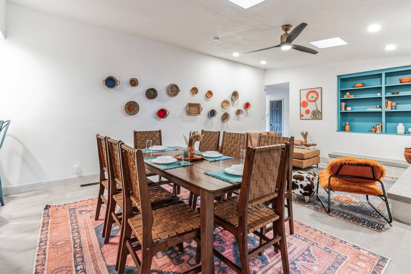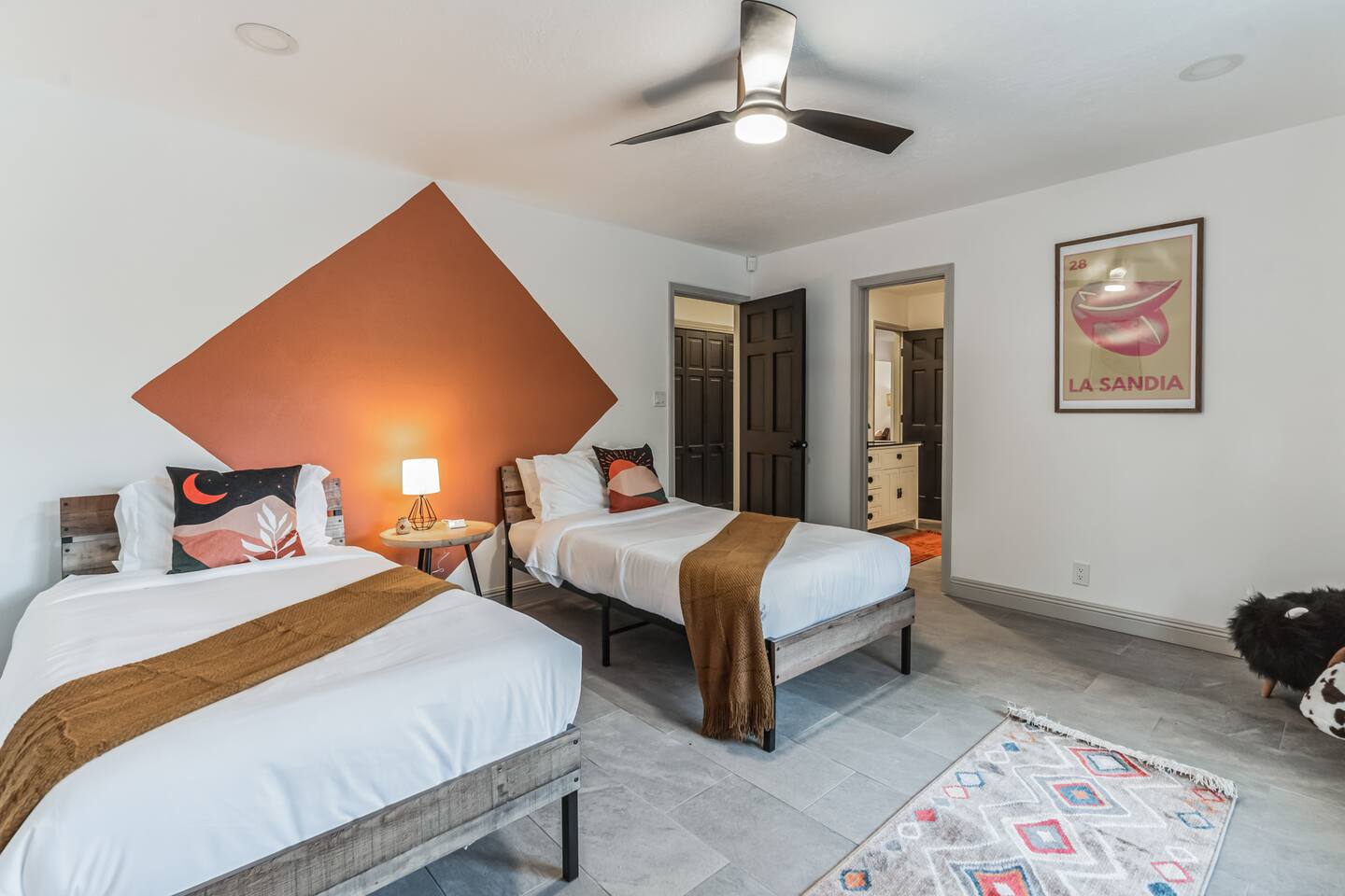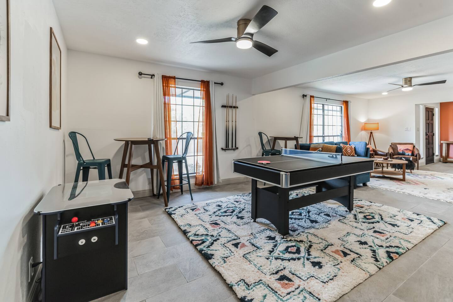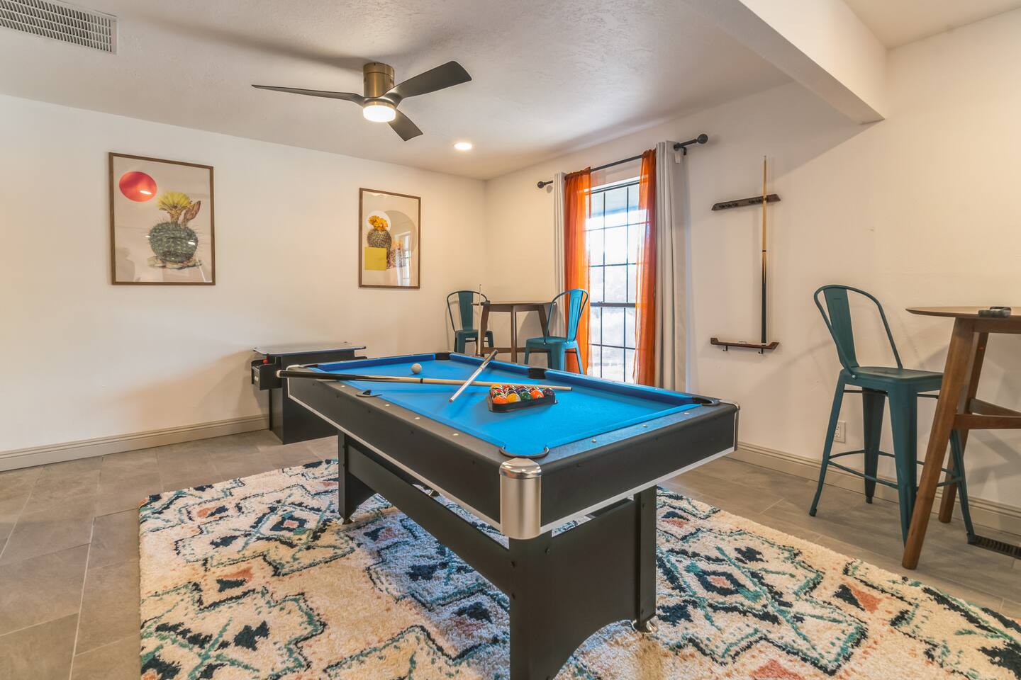 🛋️ Living Room Step into the vibrant charm of our New Mexico-inspired living room. Enjoy a stunning desert mural, a cozy blue sectional sofa, and elegant leather armchairs. With a smart TV, pool table, and ample natural light from large windows, this space is perfect for relaxation and creating memorable moments. 🍽️ Dining Room Savor meals in our cozy dining area featuring a round wooden table with stylish mustard chairs, perfect for intimate gatherings. Floor-to-ceiling glass doors provide ample natural light and views to the outside, enhancing the space. The room is decorated with a vibrant rug and colorful wall plates, adding artistic flair, while a blue built-in shelving unit displays chic decor. This inviting setting is ideal for both casual and formal dining. 🍳 Kitchen Cook with ease in our modern kitchen, boasting stainless steel appliances, elegant white cabinetry, and marble countertops. The open layout flows seamlessly into the dining area, making it perfect for entertaining. 🛌 Bedrooms Experience the luxury and sophistication of our four meticulously curated bedrooms, meticulously crafted to elevate your relaxation experience. ✦ Step into the first bedroom, where a lavish king-sized bed awaits beneath a captivating blue accent wall, inviting you into a realm of tranquility and indulgence. ✦ The second bedroom offers generous space with two king-sized beds, ensuring ample room and opulent comfort for your guests. ✦ In the third bedroom, discover the allure of two queen-sized beds, promising a restful haven for your nights. ✦ Lastly, the fourth bedroom caters to younger visitors with two snug twin beds, providing a cozy retreat after a day of exploration. Each room is a unique blend of contemporary design and vibrant hues, thoughtfully arranged to create an ambiance of warmth and rejuvenation, perfect for unwinding and revitalizing. 🛒 Grocery Stores ✦ Smith’s Food and Drug Address: 200 Tramway Blvd SE, Albuquerque, NM 87123 Distance: Approximately 1.3 miles away. ✦Sprouts Farmers Market - Four Hills Address: 13150 Central Ave. SE, Albuquerque, NM 87123 Distance: Approximately 1.5 miles away. ✦Sprouts Farmers Market - Montgomery Blvd. Address: Montgomery Blvd., Albuquerque, NM Distance: Approximately 3.5 miles away. 🍕 Restaurants ✦ MÁS Tapas y Vino - Located at 125 Second St NW, Albuquerque, approximately 4.5 miles away. This restaurant offers a selection of Spanish tapas and a cozy atmosphere. ✦ Carrie's at The Clyde - Situated at 625 Silver Ave SW, Albuquerque, about 5 miles from your location. It features a Southwest-inspired menu in a setting that harks back to a bygone era of dining. ✦ Seasons 52 - Albuquerque - Found at 6600 Menaul Blvd NE, Albuquerque, roughly 4.8 miles away. This restaurant is known for its seasonal menu that emphasizes fresh, natural ingredients. 🎢 Attractions ✦ Old Town Albuquerque (Approx. 15 min drive): Explore the historic heart of the city with adobe buildings, shops, galleries, and restaurants. Perfect for a stroll and soaking in New Mexican culture. ✦ Sandia Peak Tramway (Approx. 25 min drive): Take a breathtaking tram ride up to Sandia Peak for stunning views, hiking trails, and a restaurant at the summit. ✦ ABQ BioPark (Approx. 20 min drive): Enjoy a visit to the BioPark, including the Zoo, Aquarium, and Botanic Garden. A fun, educational experience for all ages. ✦ Hot Air Balloon Ride (Approx. 30 min drive): Experience Albuquerque’s famous hot air balloon rides, offering a magical sunrise journey over the Rio Grande Valley. ✦ Indian Pueblo Cultural Center (Approx. 15 min drive): Delve into the history and culture of New Mexico’s Pueblo people through exhibits, traditional dances, and workshops. ✦ Explore Science Center and Children's Museum (Approx. 20 min drive): Perfect for families, this interactive museum offers hands-on exhibits focused on science and learning. ✦ Shopping at Nob Hill (Approx. 15 min drive): Visit this trendy neighborhood filled with unique shops, boutiques, and cafes—ideal for finding one-of-a-kind souvenirs. ✦ The National Museum of Nuclear Science & History (pprox. 10 mins drive): This museum offers interactive exhibits and educational programs about the history and science of nuclear energy and its uses. ✦ Tingley Beach (Approx. 20 min drive): Enjoy outdoor time with several fishing lakes, walking paths, and picnic areas for a relaxing day out.