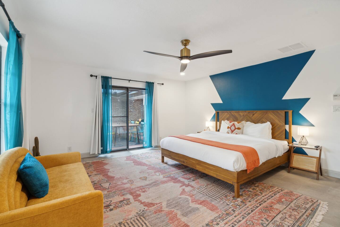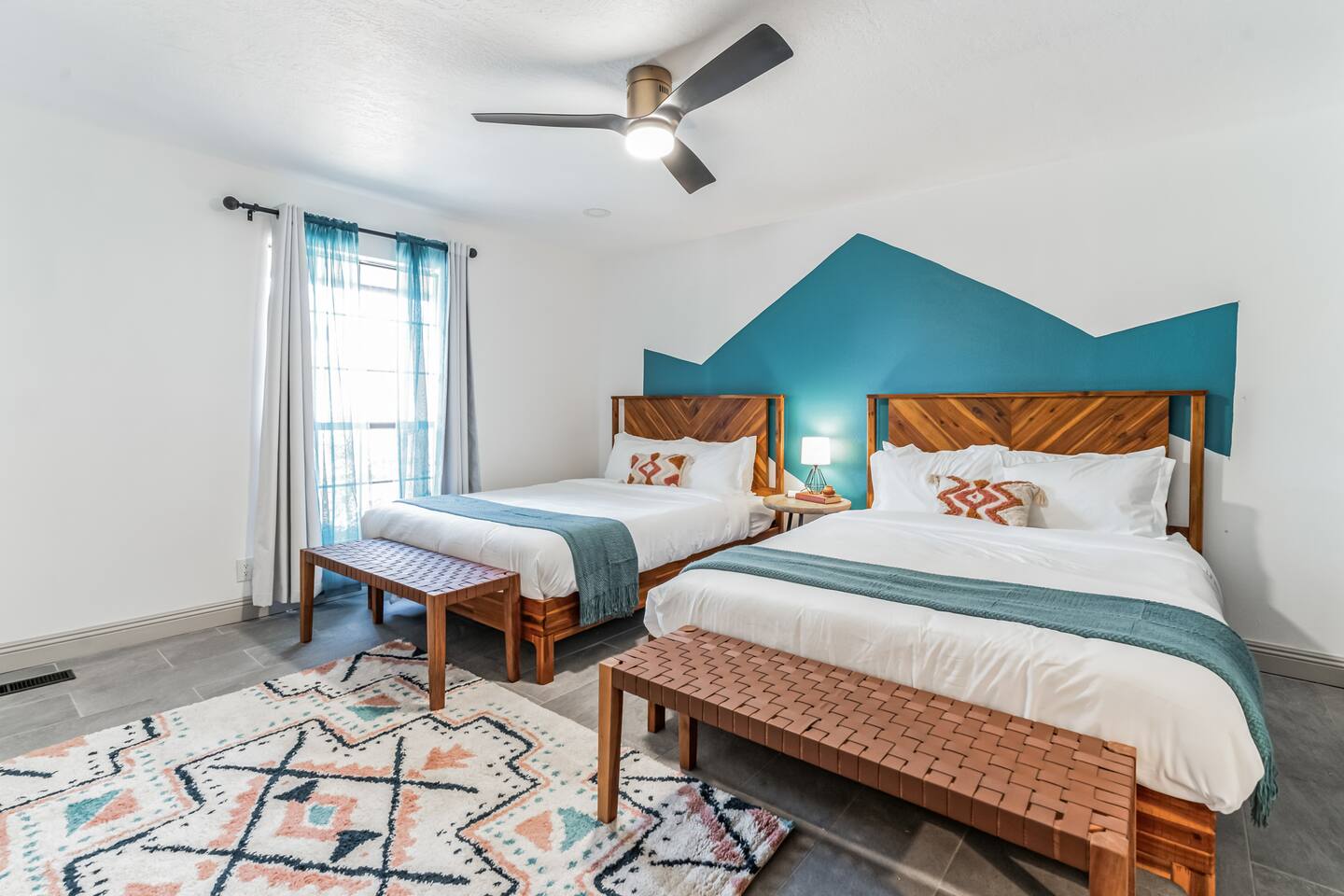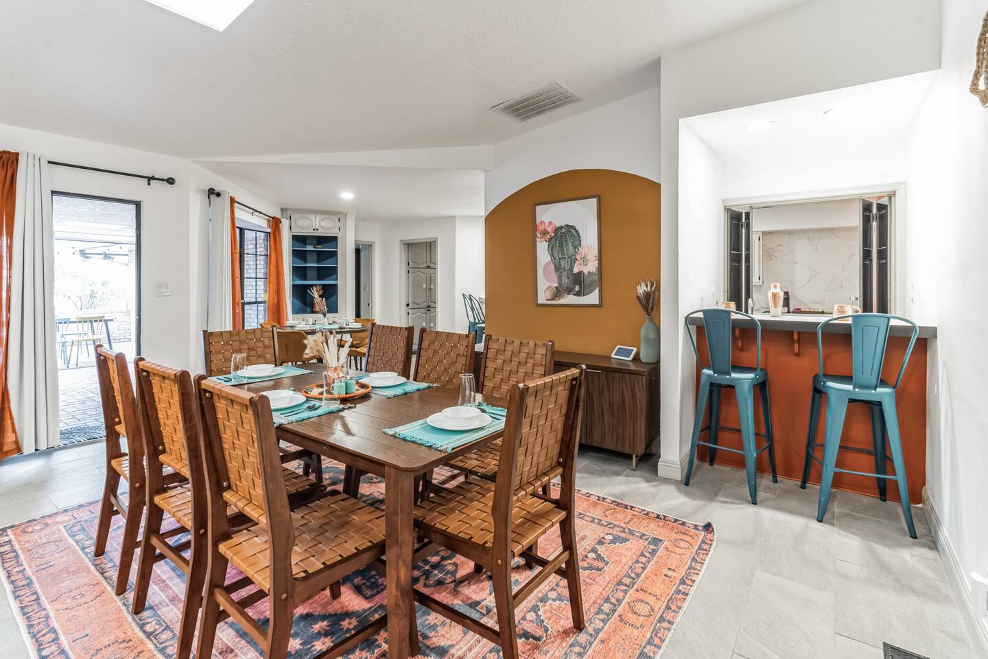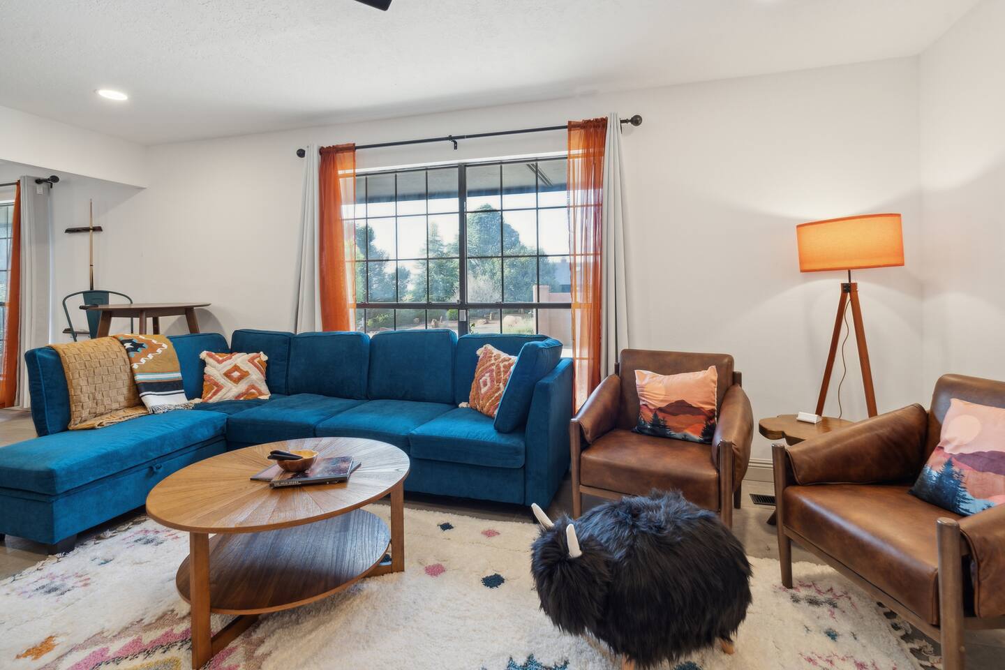 🛋️ Living Room Step into the vibrant charm of our New Mexico-inspired living room. Enjoy a stunning desert mural, a cozy blue sectional sofa, and elegant leather armchairs. With a smart TV, pool table, and ample natural light from large windows, this space is perfect for relaxation and creating memorable moments. 🍽️ Dining Room Savor meals in our cozy dining area featuring a round wooden table with stylish mustard chairs, perfect for intimate gatherings. Floor-to-ceiling glass doors provide ample natural light and views to the outside, enhancing the space. The room is decorated with a vibrant rug and colorful wall plates, adding artistic flair, while a blue built-in shelving unit displays chic decor. This inviting setting is ideal for both casual and formal dining. 🍳 Kitchen Cook with ease in our modern kitchen, boasting stainless steel appliances, elegant white cabinetry, and marble countertops. The open layout flows seamlessly into the dining area, making it perfect for entertaining. 🛌 Bedrooms Experience the luxury and sophistication of our four meticulously curated bedrooms, meticulously crafted to elevate your relaxation experience. ✦ Step into the first bedroom, where a lavish king-sized bed awaits beneath a captivating blue accent wall, inviting you into a realm of tranquility and indulgence. ✦ The second bedroom offers generous space with two king-sized beds, ensuring ample room and opulent comfort for your guests. ✦ In the third bedroom, discover the allure of two queen-sized beds, promising a restful haven for your nights. ✦ Lastly, the fourth bedroom caters to younger visitors with two snug twin beds, providing a cozy retreat after a day of exploration. Each room is a unique blend of contemporary design and vibrant hues, thoughtfully arranged to create an ambiance of warmth and rejuvenation, perfect for unwinding and revitalizing. 🛒 Grocery Stores ✦ Smith’s Food and Drug Address: 200 Tramway Blvd SE, Albuquerque, NM 87123 Distance: Approximately 1.3 miles away. ✦Sprouts Farmers Market - Four Hills Address: 13150 Central Ave. SE, Albuquerque, NM 87123 Distance: Approximately 1.5 miles away. ✦Sprouts Farmers Market - Montgomery Blvd. Address: Montgomery Blvd., Albuquerque, NM Distance: Approximately 3.5 miles away. 🍕 Restaurants ✦ MÁS Tapas y Vino - Located at 125 Second St NW, Albuquerque, approximately 4.5 miles away. This restaurant offers a selection of Spanish tapas and a cozy atmosphere. ✦ Carrie's at The Clyde - Situated at 625 Silver Ave SW, Albuquerque, about 5 miles from your location. It features a Southwest-inspired menu in a setting that harks back to a bygone era of dining. ✦ Seasons 52 - Albuquerque - Found at 6600 Menaul Blvd NE, Albuquerque, roughly 4.8 miles away. This restaurant is known for its seasonal menu that emphasizes fresh, natural ingredients. 🎢 Attractions ✦ Old Town Albuquerque (Approx. 15 min drive): Explore the historic heart of the city with adobe buildings, shops, galleries, and restaurants. Perfect for a stroll and soaking in New Mexican culture. ✦ Sandia Peak Tramway (Approx. 25 min drive): Take a breathtaking tram ride up to Sandia Peak for stunning views, hiking trails, and a restaurant at the summit. ✦ ABQ BioPark (Approx. 20 min drive): Enjoy a visit to the BioPark, including the Zoo, Aquarium, and Botanic Garden. A fun, educational experience for all ages. ✦ Hot Air Balloon Ride (Approx. 30 min drive): Experience Albuquerque’s famous hot air balloon rides, offering a magical sunrise journey over the Rio Grande Valley. ✦ Indian Pueblo Cultural Center (Approx. 15 min drive): Delve into the history and culture of New Mexico’s Pueblo people through exhibits, traditional dances, and workshops. ✦ Explore Science Center and Children's Museum (Approx. 20 min drive): Perfect for families, this interactive museum offers hands-on exhibits focused on science and learning. ✦ Shopping at Nob Hill (Approx. 15 min drive): Visit this trendy neighborhood filled with unique shops, boutiques, and cafes—ideal for finding one-of-a-kind souvenirs. ✦ The National Museum of Nuclear Science & History (pprox. 10 mins drive): This museum offers interactive exhibits and educational programs about the history and science of nuclear energy and its uses. ✦ Tingley Beach (Approx. 20 min drive): Enjoy outdoor time with several fishing lakes, walking paths, and picnic areas for a relaxing day out.