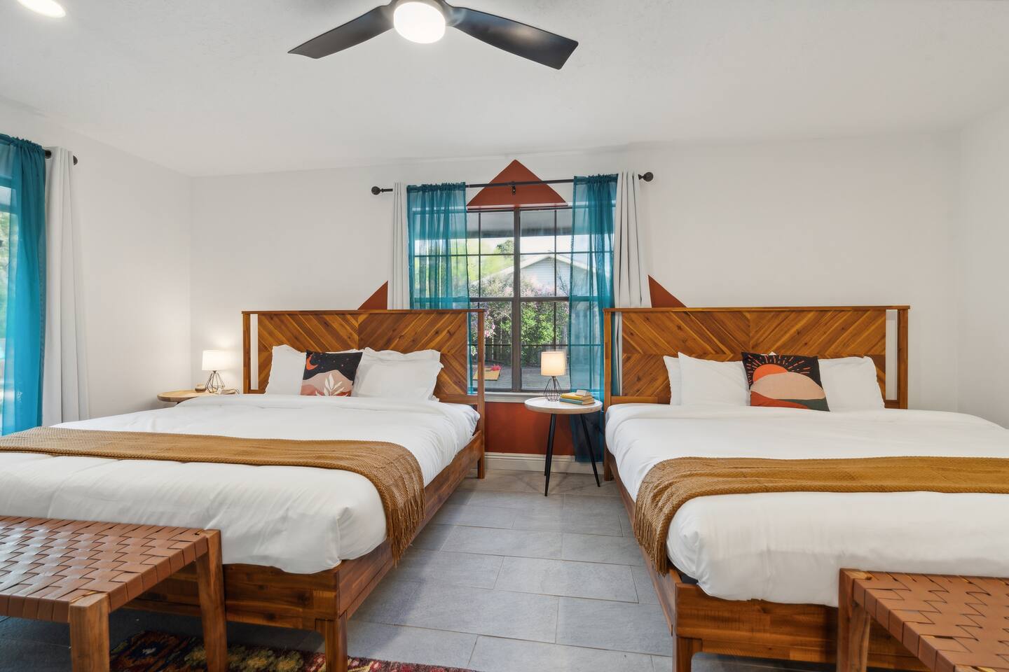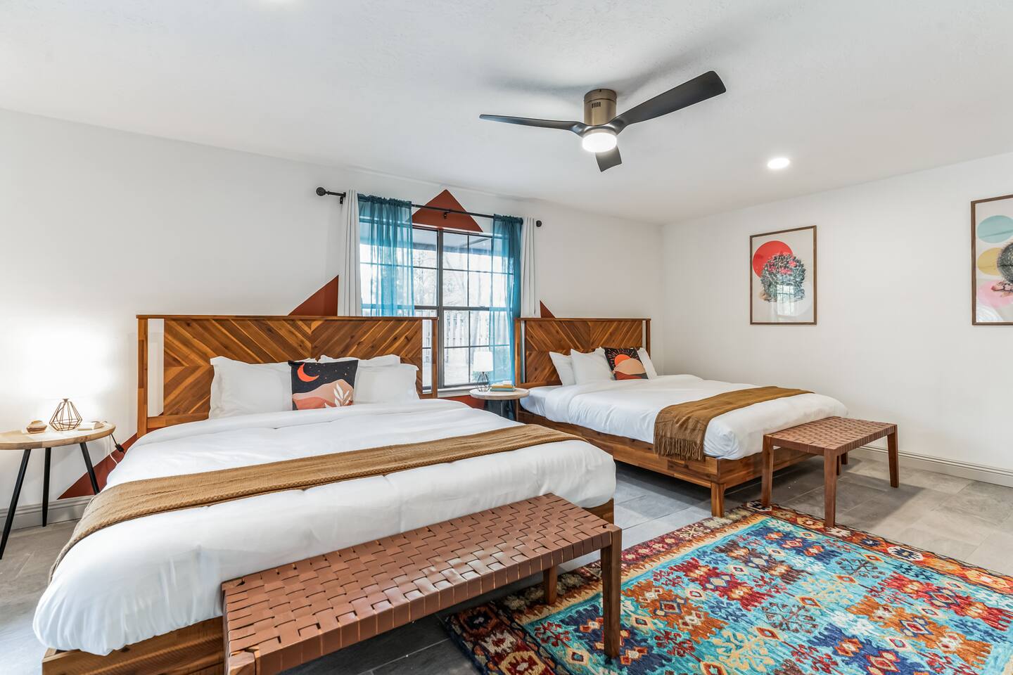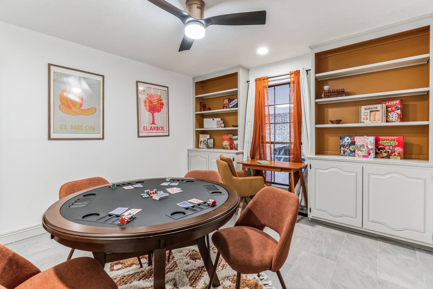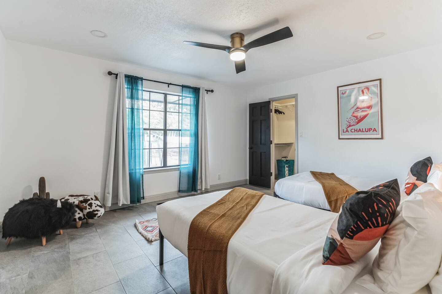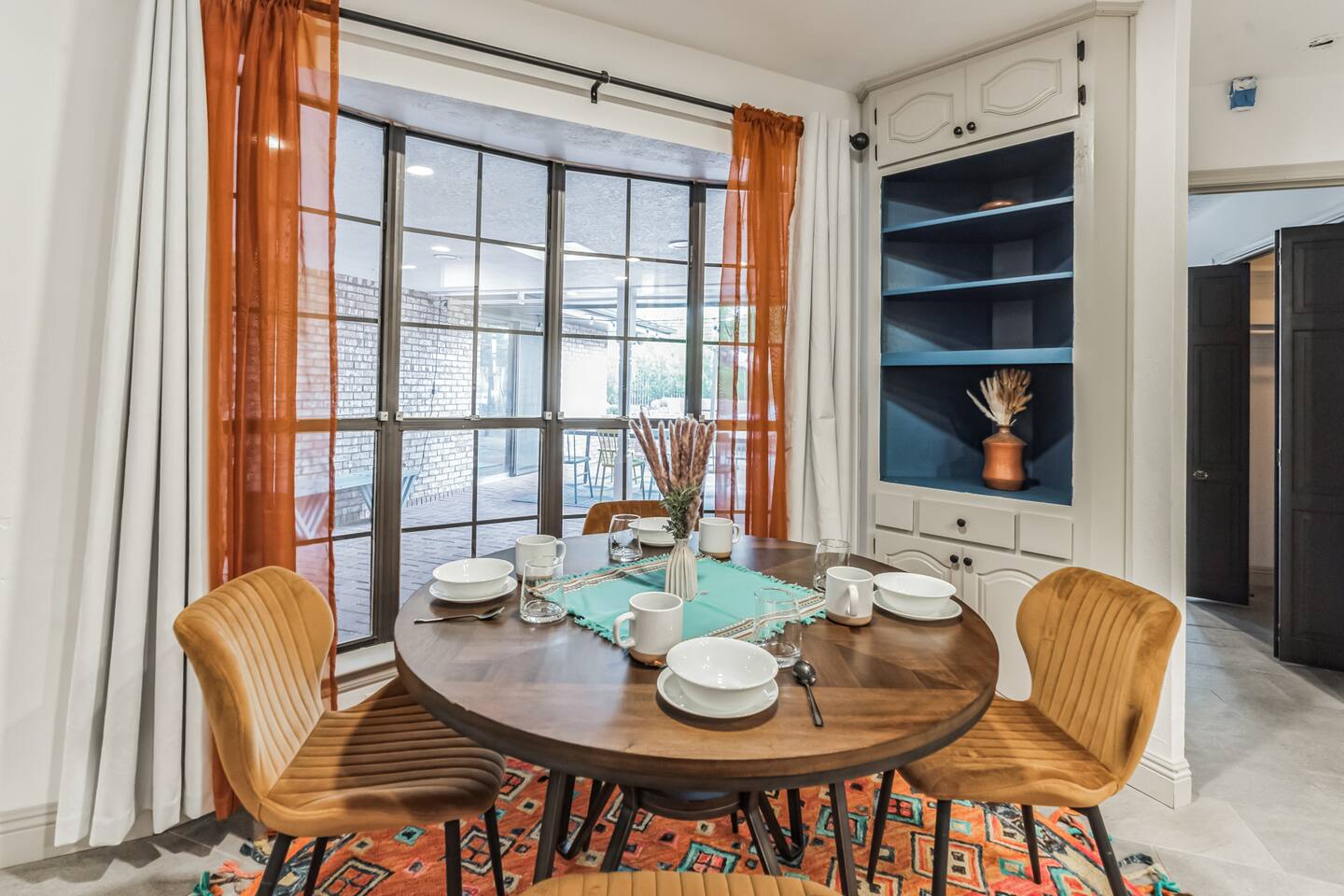🛋️ Living Room Step into the vibrant charm of our New Mexico-inspired living room. Enjoy a stunning desert mural, a cozy blue sectional sofa, and elegant leather armchairs. With a smart TV, pool table, and ample natural light from large windows, this space is perfect for relaxation and creating memorable moments. 🍽️ Dining Room Savor meals in our cozy dining area featuring a round wooden table with stylish mustard chairs, perfect for intimate gatherings. Floor-to-ceiling glass doors provide ample natural light and views to the outside, enhancing the space. The room is decorated with a vibrant rug and colorful wall plates, adding artistic flair, while a blue built-in shelving unit displays chic decor. This inviting setting is ideal for both casual and formal dining. 🍳 Kitchen Cook with ease in our modern kitchen, boasting stainless steel appliances, elegant white cabinetry, and marble countertops. The open layout flows seamlessly into the dining area, making it perfect for entertaining. 🛌 Bedrooms Experience the luxury and sophistication of our four meticulously curated bedrooms, meticulously crafted to elevate your relaxation experience. ✦ Step into the first bedroom, where a lavish king-sized bed awaits beneath a captivating blue accent wall, inviting you into a realm of tranquility and indulgence. ✦ The second bedroom offers generous space with two king-sized beds, ensuring ample room and opulent comfort for your guests. ✦ In the third bedroom, discover the allure of two queen-sized beds, promising a restful haven for your nights. ✦ Lastly, the fourth bedroom caters to younger visitors with two snug twin beds, providing a cozy retreat after a day of exploration. Each room is a unique blend of contemporary design and vibrant hues, thoughtfully arranged to create an ambiance of warmth and rejuvenation, perfect for unwinding and revitalizing. 🛒 Grocery Stores ✦ Smith’s Food and Drug Address: 200 Tramway Blvd SE, Albuquerque, NM 87123 Distance: Approximately 1.3 miles away. ✦Sprouts Farmers Market - Four Hills Address: 13150 Central Ave. SE, Albuquerque, NM 87123 Distance: Approximately 1.5 miles away. ✦Sprouts Farmers Market - Montgomery Blvd. Address: Montgomery Blvd., Albuquerque, NM Distance: Approximately 3.5 miles away. 🍕 Restaurants ✦ MÁS Tapas y Vino - Located at 125 Second St NW, Albuquerque, approximately 4.5 miles away. This restaurant offers a selection of Spanish tapas and a cozy atmosphere. ✦ Carrie's at The Clyde - Situated at 625 Silver Ave SW, Albuquerque, about 5 miles from your location. It features a Southwest-inspired menu in a setting that harks back to a bygone era of dining. ✦ Seasons 52 - Albuquerque - Found at 6600 Menaul Blvd NE, Albuquerque, roughly 4.8 miles away. This restaurant is known for its seasonal menu that emphasizes fresh, natural ingredients. 🎢 Attractions ✦ Old Town Albuquerque (Approx. 15 min drive): Explore the historic heart of the city with adobe buildings, shops, galleries, and restaurants. Perfect for a stroll and soaking in New Mexican culture. ✦ Sandia Peak Tramway (Approx. 25 min drive): Take a breathtaking tram ride up to Sandia Peak for stunning views, hiking trails, and a restaurant at the summit. ✦ ABQ BioPark (Approx. 20 min drive): Enjoy a visit to the BioPark, including the Zoo, Aquarium, and Botanic Garden. A fun, educational experience for all ages. ✦ Hot Air Balloon Ride (Approx. 30 min drive): Experience Albuquerque’s famous hot air balloon rides, offering a magical sunrise journey over the Rio Grande Valley. ✦ Indian Pueblo Cultural Center (Approx. 15 min drive): Delve into the history and culture of New Mexico’s Pueblo people through exhibits, traditional dances, and workshops. ✦ Explore Science Center and Children's Museum (Approx. 20 min drive): Perfect for families, this interactive museum offers hands-on exhibits focused on science and learning. ✦ Shopping at Nob Hill (Approx. 15 min drive): Visit this trendy neighborhood filled with unique shops, boutiques, and cafes—ideal for finding one-of-a-kind souvenirs. ✦ The National Museum of Nuclear Science & History (pprox. 10 mins drive): This museum offers interactive exhibits and educational programs about the history and science of nuclear energy and its uses. ✦ Tingley Beach (Approx. 20 min drive): Enjoy outdoor time with several fishing lakes, walking paths, and picnic areas for a relaxing day out.