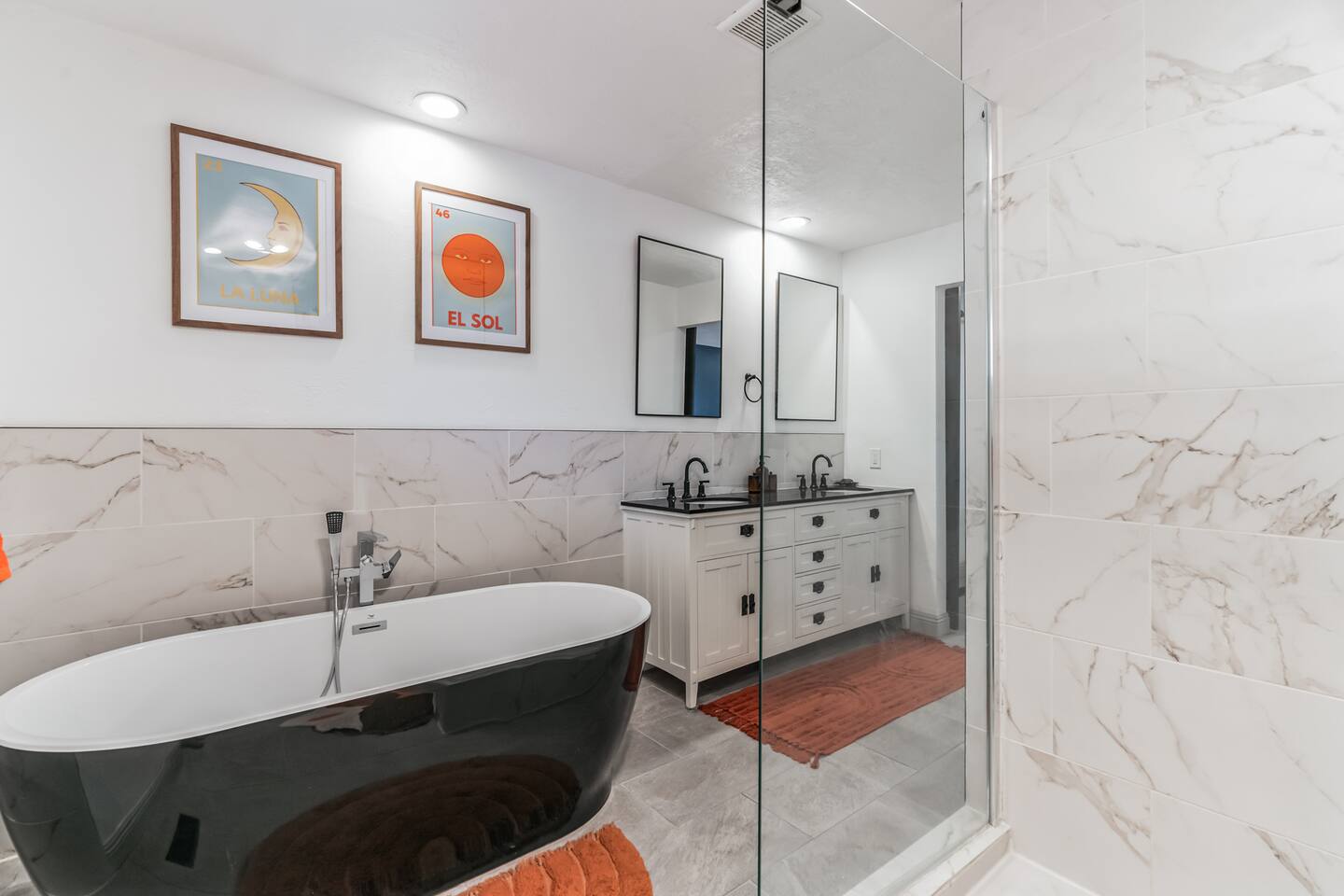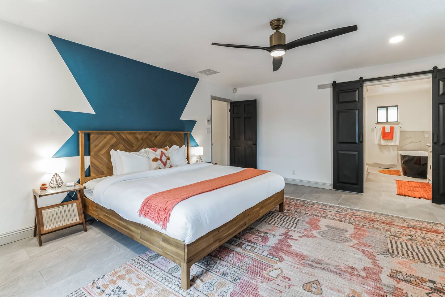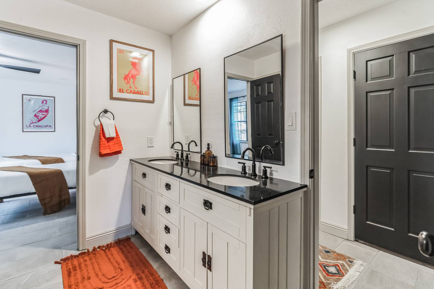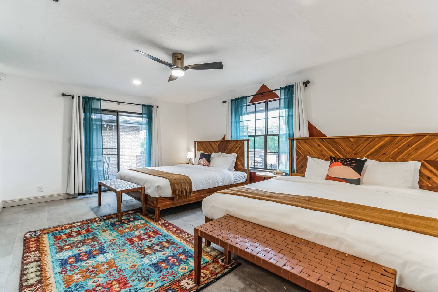 🛋️ Living Room Step into the vibrant charm of our New Mexico-inspired living room. Enjoy a stunning desert mural, a cozy blue sectional sofa, and elegant leather armchairs. With a smart TV, pool table, and ample natural light from large windows, this space is perfect for relaxation and creating memorable moments. 🍽️ Dining Room Savor meals in our cozy dining area featuring a round wooden table with stylish mustard chairs, perfect for intimate gatherings. Floor-to-ceiling glass doors provide ample natural light and views to the outside, enhancing the space. The room is decorated with a vibrant rug and colorful wall plates, adding artistic flair, while a blue built-in shelving unit displays chic decor. This inviting setting is ideal for both casual and formal dining. 🍳 Kitchen Cook with ease in our modern kitchen, boasting stainless steel appliances, elegant white cabinetry, and marble countertops. The open layout flows seamlessly into the dining area, making it perfect for entertaining. 🛌 Bedrooms Experience the luxury and sophistication of our four meticulously curated bedrooms, meticulously crafted to elevate your relaxation experience. ✦ Step into the first bedroom, where a lavish king-sized bed awaits beneath a captivating blue accent wall, inviting you into a realm of tranquility and indulgence. ✦ The second bedroom offers generous space with two king-sized beds, ensuring ample room and opulent comfort for your guests. ✦ In the third bedroom, discover the allure of two queen-sized beds, promising a restful haven for your nights. ✦ Lastly, the fourth bedroom caters to younger visitors with two snug twin beds, providing a cozy retreat after a day of exploration. Each room is a unique blend of contemporary design and vibrant hues, thoughtfully arranged to create an ambiance of warmth and rejuvenation, perfect for unwinding and revitalizing. 🛒 Grocery Stores ✦ Smith’s Food and Drug Address: 200 Tramway Blvd SE, Albuquerque, NM 87123 Distance: Approximately 1.3 miles away. ✦Sprouts Farmers Market - Four Hills Address: 13150 Central Ave. SE, Albuquerque, NM 87123 Distance: Approximately 1.5 miles away. ✦Sprouts Farmers Market - Montgomery Blvd. Address: Montgomery Blvd., Albuquerque, NM Distance: Approximately 3.5 miles away. 🍕 Restaurants ✦ MÁS Tapas y Vino - Located at 125 Second St NW, Albuquerque, approximately 4.5 miles away. This restaurant offers a selection of Spanish tapas and a cozy atmosphere. ✦ Carrie's at The Clyde - Situated at 625 Silver Ave SW, Albuquerque, about 5 miles from your location. It features a Southwest-inspired menu in a setting that harks back to a bygone era of dining. ✦ Seasons 52 - Albuquerque - Found at 6600 Menaul Blvd NE, Albuquerque, roughly 4.8 miles away. This restaurant is known for its seasonal menu that emphasizes fresh, natural ingredients. 🎢 Attractions ✦ Old Town Albuquerque (Approx. 15 min drive): Explore the historic heart of the city with adobe buildings, shops, galleries, and restaurants. Perfect for a stroll and soaking in New Mexican culture. ✦ Sandia Peak Tramway (Approx. 25 min drive): Take a breathtaking tram ride up to Sandia Peak for stunning views, hiking trails, and a restaurant at the summit. ✦ ABQ BioPark (Approx. 20 min drive): Enjoy a visit to the BioPark, including the Zoo, Aquarium, and Botanic Garden. A fun, educational experience for all ages. ✦ Hot Air Balloon Ride (Approx. 30 min drive): Experience Albuquerque’s famous hot air balloon rides, offering a magical sunrise journey over the Rio Grande Valley. ✦ Indian Pueblo Cultural Center (Approx. 15 min drive): Delve into the history and culture of New Mexico’s Pueblo people through exhibits, traditional dances, and workshops. ✦ Explore Science Center and Children's Museum (Approx. 20 min drive): Perfect for families, this interactive museum offers hands-on exhibits focused on science and learning. ✦ Shopping at Nob Hill (Approx. 15 min drive): Visit this trendy neighborhood filled with unique shops, boutiques, and cafes—ideal for finding one-of-a-kind souvenirs. ✦ The National Museum of Nuclear Science & History (pprox. 10 mins drive): This museum offers interactive exhibits and educational programs about the history and science of nuclear energy and its uses. ✦ Tingley Beach (Approx. 20 min drive): Enjoy outdoor time with several fishing lakes, walking paths, and picnic areas for a relaxing day out.